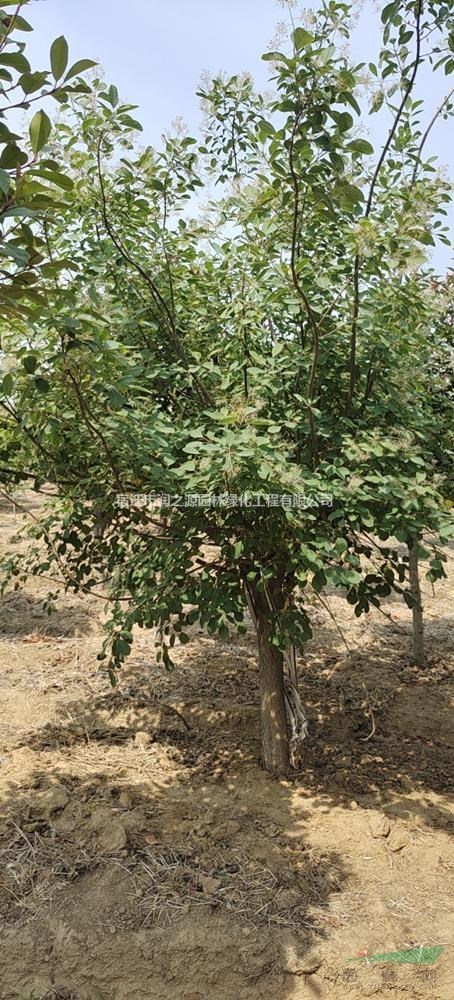 形态特征:落叶小乔木或灌木,树冠圆形,高可达3-5m,木质部黄色,树汁有异味;单叶互生,叶片全缘或具齿,叶柄细,无托叶,叶倒卵形或卵圆形。圆锥花序疏松、顶生,花小、杂性,仅少数发育;不育花的花梗花后伸长,被羽状长柔毛,宿存;苞片披针形,早落;花萼5裂,宿存,裂片披针形:花瓣5枚,长卵圆形或卵状披针形,长度为花萼大小的2倍;雄蕊5枚,着生于环状花盘的下部,花药卵形,与花丝等长,花盘5裂,紫褐色;子房近球型,偏斜,1室1胚珠;花柱3枚,分离,侧生而短,柱头小而退化。核果小,干燥,肾形扁平,绿色,侧面中部具残存花柱;外果皮薄,具脉纹,不开裂;内果皮角质;种子肾形,无胚乳。花期5-6月,果期7~8月。