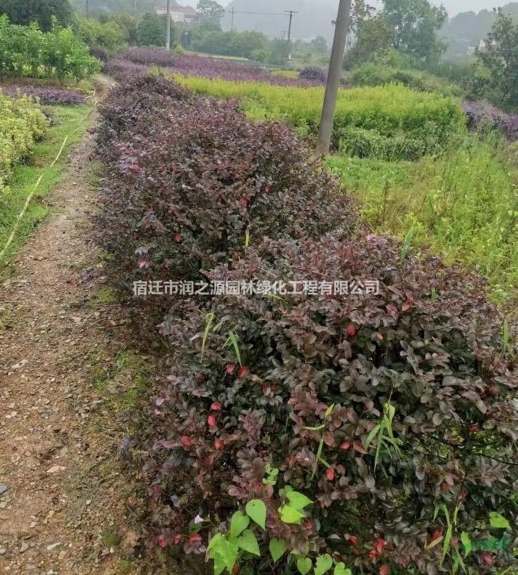 形态特征:为檵木的变种。常绿灌木或小乔木。树皮暗灰或浅灰褐色,多分枝。嫩枝红褐色,密被星状毛。叶革质互生,卵圆形或椭圆形,长2~5厘米,先端短尖,基部圆而偏斜,不对称,两面均有星状毛,全缘,暗红色。4~5月开花,花期长,约30~40天,国庆节能再次开花。花3~8朵簇生在总梗上呈顶生头状花序,紫红色。