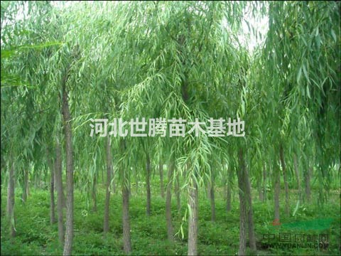 垂柳苗木基地 垂柳树形优美,抗病虫能力强。株高7.5米,树干和枝条曲折盘旋,叶片狭窄,长10厘米,垂柳枝条冬季外观迷人。用途广泛——该树种是用于工业原料林、大径材栽培、行道树、四旁植树、园林绿化、农田防护林的理想树种。。宜在岸边、水旁栽培。树姿优美,抗病能力强,无性繁殖容易,生长快,一年生扦插平均高生长不低于2.5M。含盐量不高于0.2%的土壤上能正常生长。根系发达,生长快
