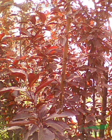 落叶小乔木,2公分红叶李,3公分红叶李,4公分红叶李,5公分红叶李,*大的20公分.干皮紫灰色,小枝淡红褐色,均光滑无毛。单叶互生,叶卵圆形或长圆状披针形,长4.5-6厘米,宽2-4厘米,先端短尖,基部楔形,缘具尖细锯齿,羽状脉5-8对,两面无毛或背面脉腋有毛,色暗绿或紫红,叶柄光滑多无腺体。花单生或2朵簇生,白色,雄蕊约25枚,略短于花瓣,花部无毛,核果扁球形,径1-3厘米,腹缝线上微见沟纹,无梗洼,熟时黄、红或紫色,光亮或微被白粉,花叶同放,花期3-4月,果常早落。
