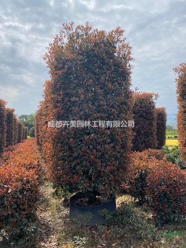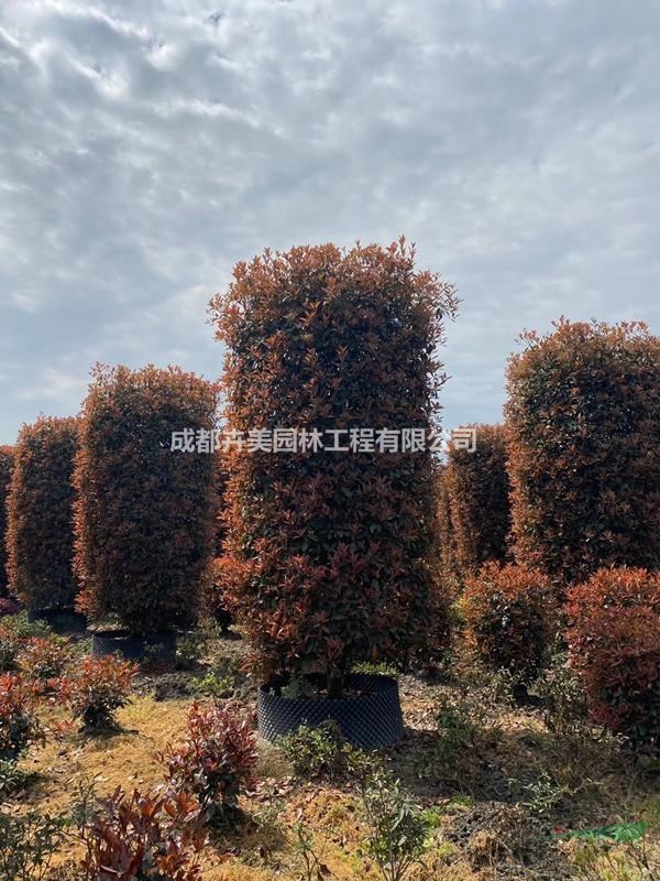 基地供应高度为400-500公分冠幅为200公分红叶石楠柱。一至二年生的红叶石楠可修剪成矮小灌木,在园林绿地中作为地被植物片植,或与其它色叶植物组合成各种图案红叶石楠也可培育成独干不明显、丛生形的小乔木,群植成大型绿篱或幕墙,在居住区、厂区绿地、街道或公路绿化隔离带应用。红叶石楠还可培育成独干、球形树冠的乔木,在绿地中孤植,或作行道树,或盆栽后在门廊及室内布置。