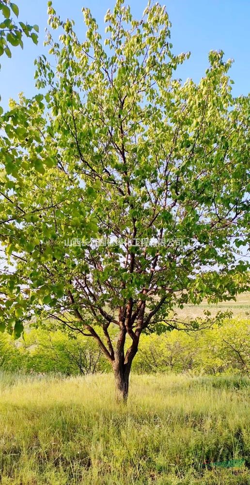 山西山杏产地,有低分枝山杏,分枝点30-80公分,高分枝山杏1米-2米,地径15-25公分,高度可达6-8米,冠幅4-6米,冠幅匀称,枝条软,向上长。山杏早春开花,在华北地区其开花早于杏树,其花朵淡雅而繁茂,花开之时,满树粉红色的花,甚是壮观。但目前从山杏的应用情况来看,其主要用作荒山造林或者用作种仁生产,在园林绿化中的应用比较少。其实,山杏也是一种不错的绿化材料,其在园林绿化中的应用大有作为。山杏可以栽种于庭院一隅,花开时节,给人以清雅之感,花落之时,落叶缤纷,整个庭院多了一分春的味道。山杏也可群植、林植于公园,花开之时透显花海之势,营造杏花村的景致,给人以群体美的感觉。山杏还可种植于山坡、土丘上,形成杏花山的景观。此外,还可选择树干通直,树形高大,树冠浓密的山杏种植于廊道,春季花开时节,蔚为壮观,一派花海景象,夏季浓密的树荫则使人神清气爽。山杏用作小区行道树或园林行道树,既美化了环境,又优化了景观。
